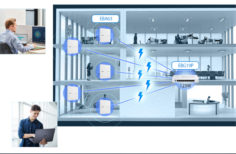 Switch Gigabit PoE EBG19P + VPN wired Router. 8 PoE+ ports up to 123W , Up to 3 WAN ethernet ports + 1 USB WAN. 1 ăng-ten Bluetooth, 1.8GHz Dual-core, 256MB Flash, 512MD RAM. Tính năng nổi bật: AiProtection Pro bảo mật cao cấp. Bảo mật VPN, Firewall. Chứng nhận đạt tiêu chuẩn mật mã dân sự.