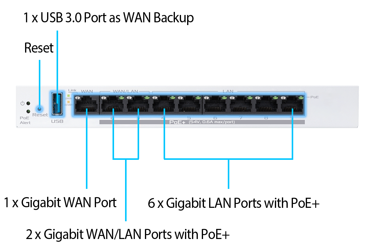 Gigabit LAN Port x 8 (Changable WAN/LAN Port x 2)