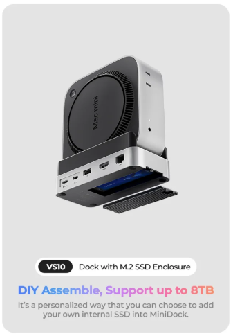 - Đầu ra: Hỗ trợ SSD M.2 NVME/SATA *1 (Max 8TB) (10Gbps); USB-A 3.2 *1 (10Gbps); USB-C 3.2 *1 (10Gbps); USB-A 3.0 *2 (5Gbps); TF/SD 3.0 *2; RJ45 1G *1; HDMI 2.0 (4K 60Hz), 1 cổng sạc PD100W.
