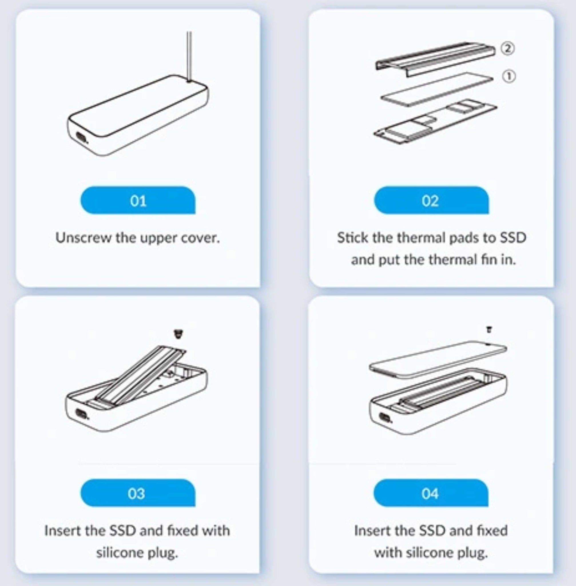 - Bảo quản: Khi không sử dụng, hộp ổ cứng sẽ tự động chuyển sang chế độ ngủ để tiết kiệm năng lượng; tháo ổ SSD ra nếu cần bảo quản lâu dài.